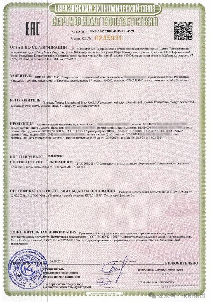 Yongce Group has obtained the EAC and GOST-K certifications in Kazakhstan.