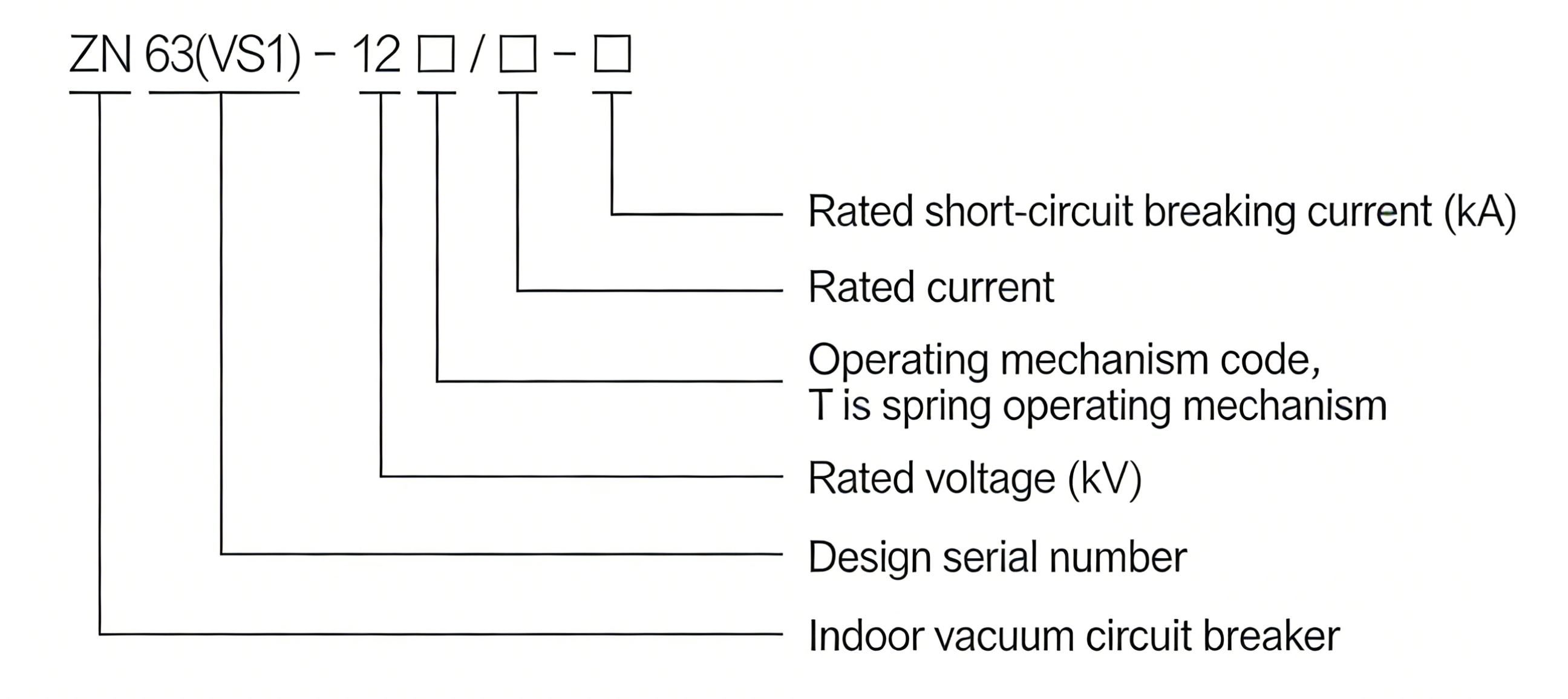 The coding of the product model contains the core structural characteristics and parameter information of the vacuum circuit breaker. The specific meaning of each part of the model is as follows: