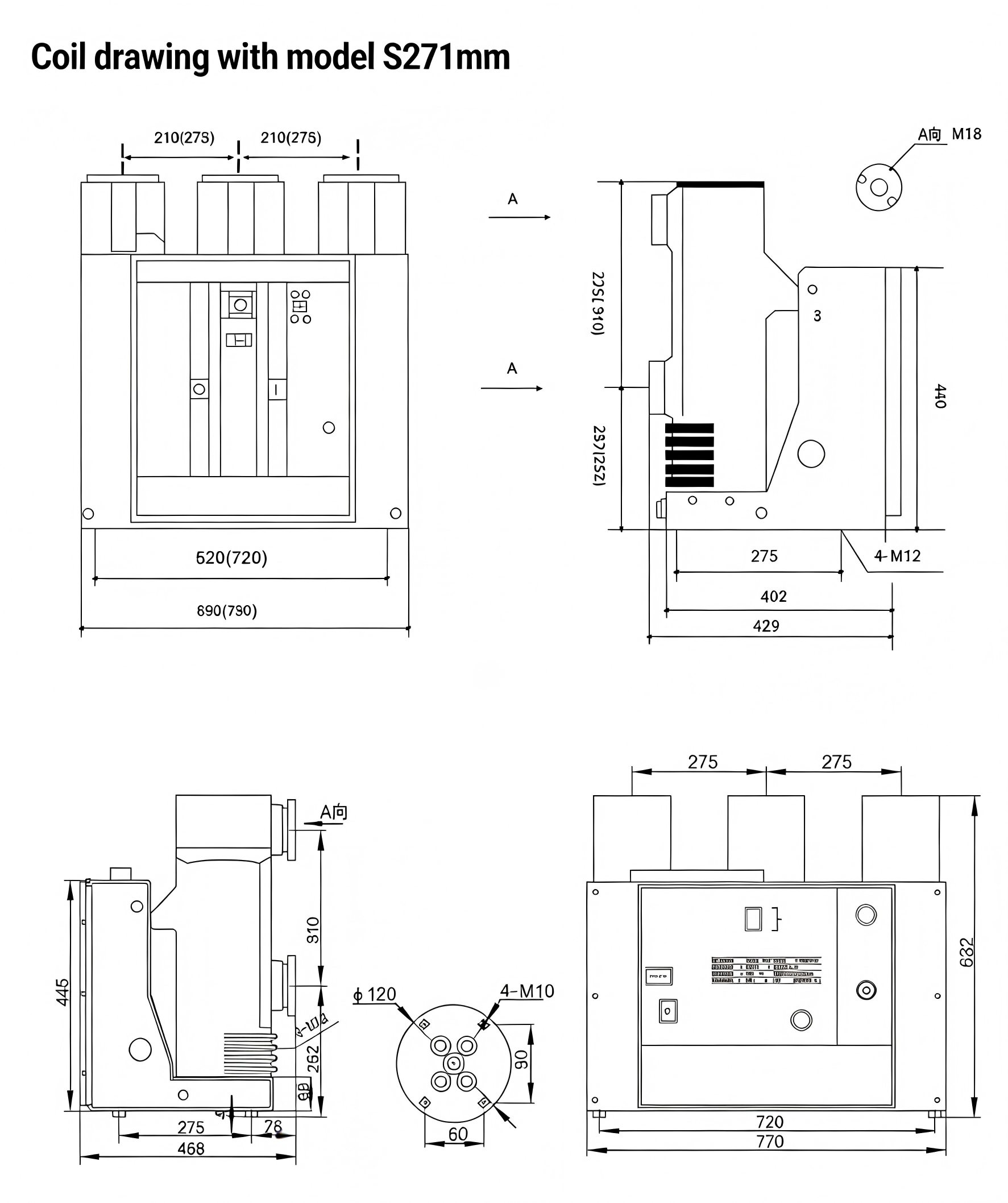 The outline and installation dimensions of the product are shown in the figure below (the numbers in the brackets are the dimensions with 275mm phase distance):
