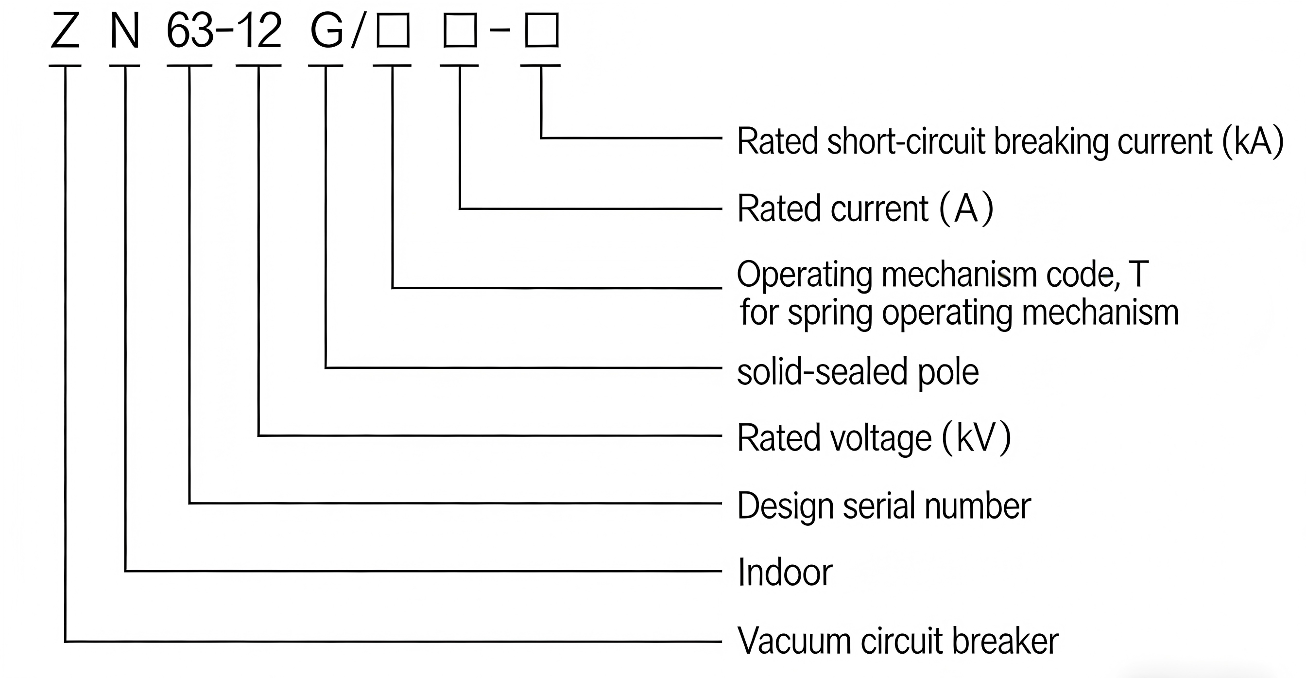 The coding of the product model contains the core structural characteristics and parameter information of the vacuum circuit breaker. The specific meaning of each part of the model is as follows: