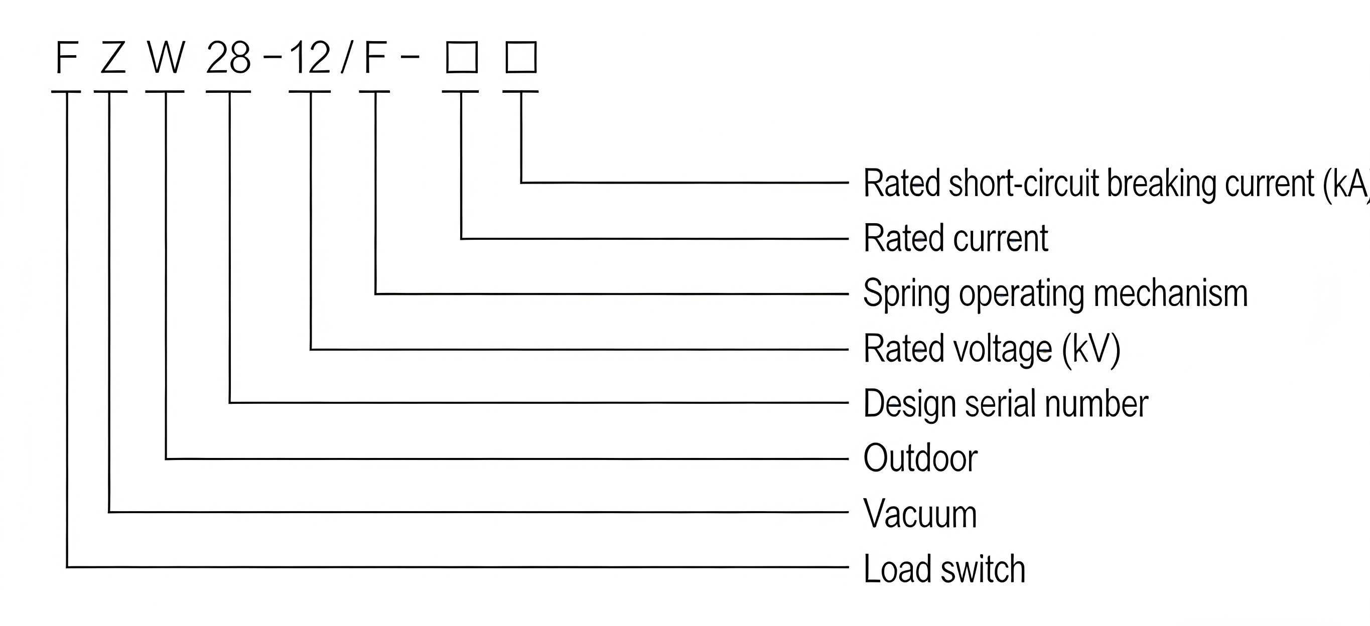 The coding of the product model contains the core structural characteristics and parameter information of the load break switch. The specific meaning of each part of the model is as follows: