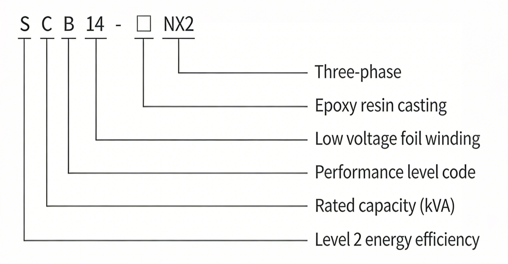 The coding of the product model contains the core structural characteristics and parameter information of the transformer. The specific meaning of each part of the model is as follows: