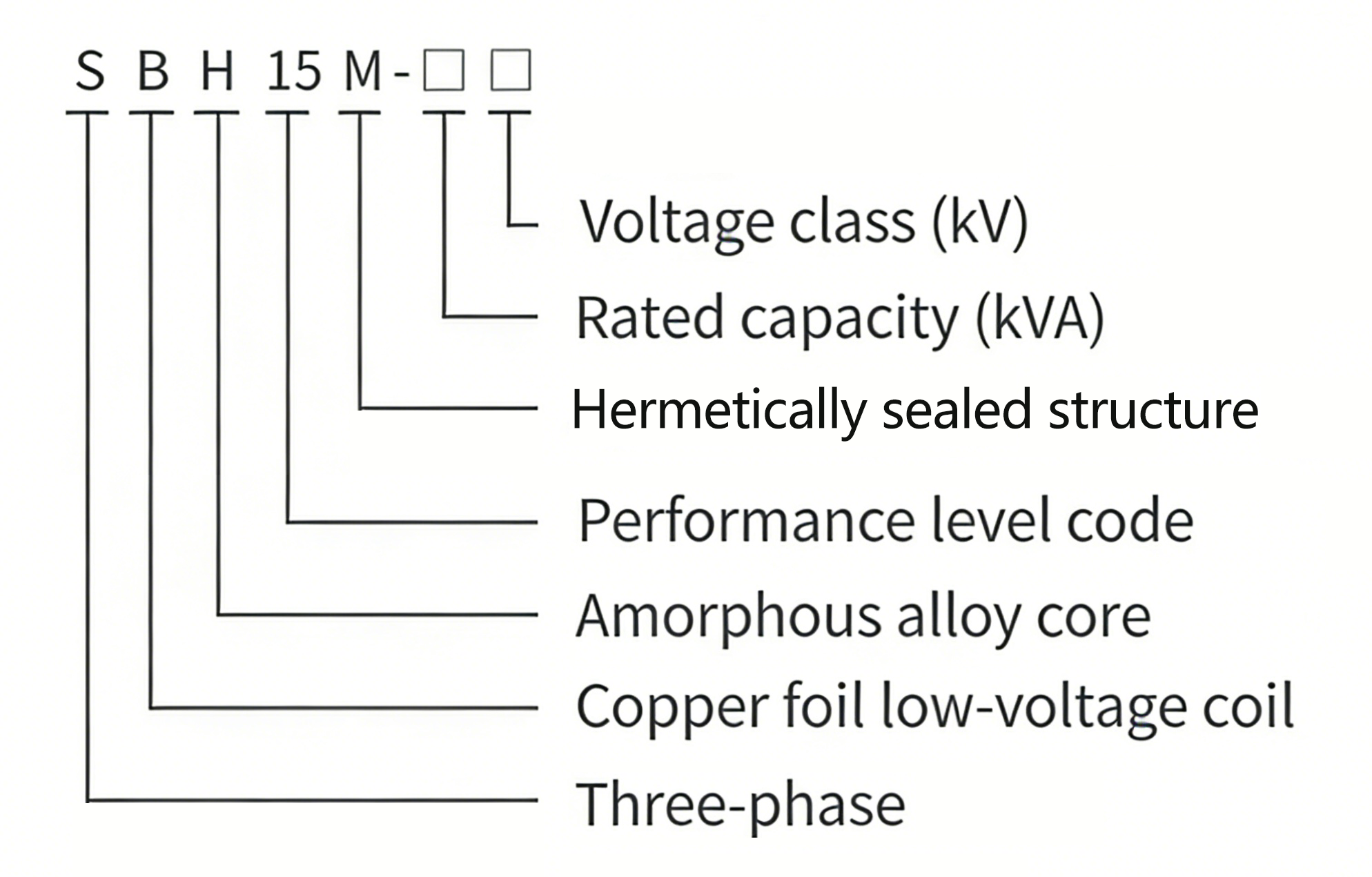 The coding of the product model contains the core structural characteristics and parameter information of the transformer. The specific meaning of each part of the model is as follows: