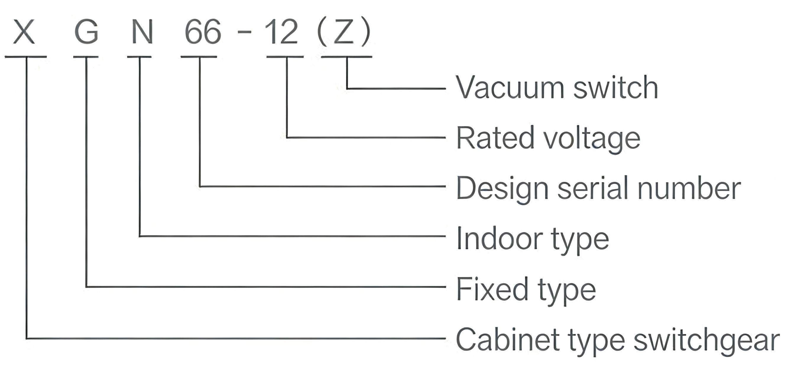 The coding of the product model contains the core structural characteristics and parameter information of the switchgear. The specific meaning of each part of the model is as follows: