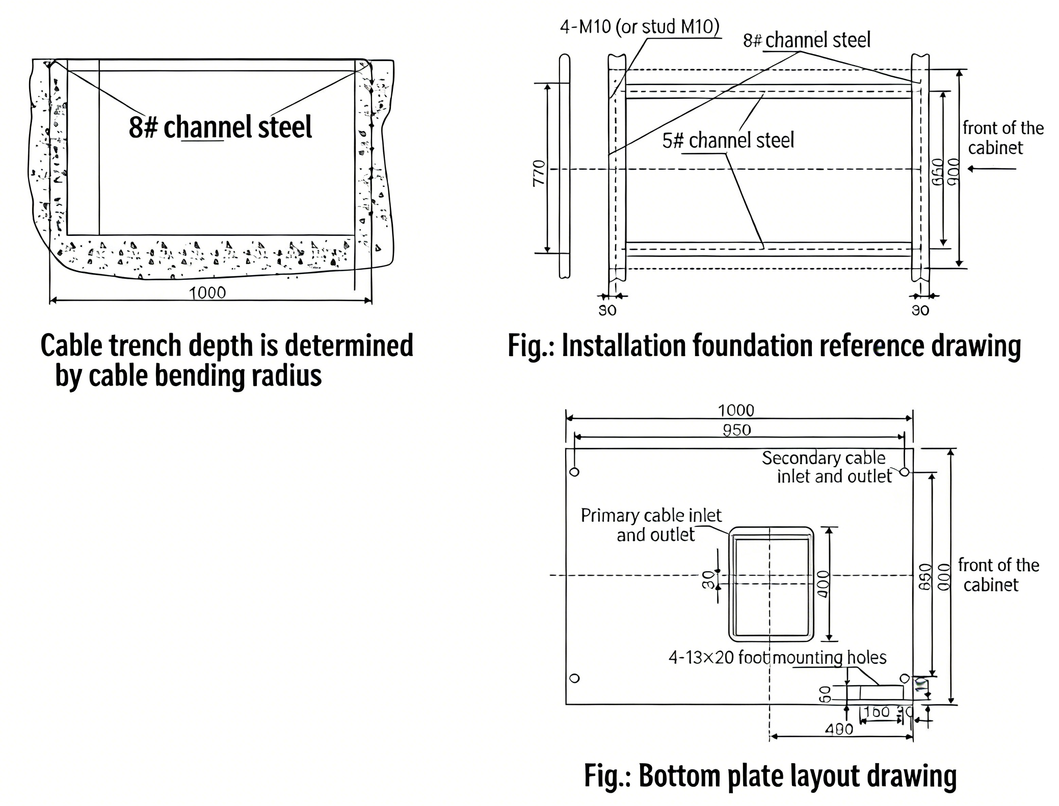 - Place the switchgear on the foundation in sequence, adjust the installation position, then fix it with M12 bolts or spot welding, and tighten the phase-to-phase M8 bolts;